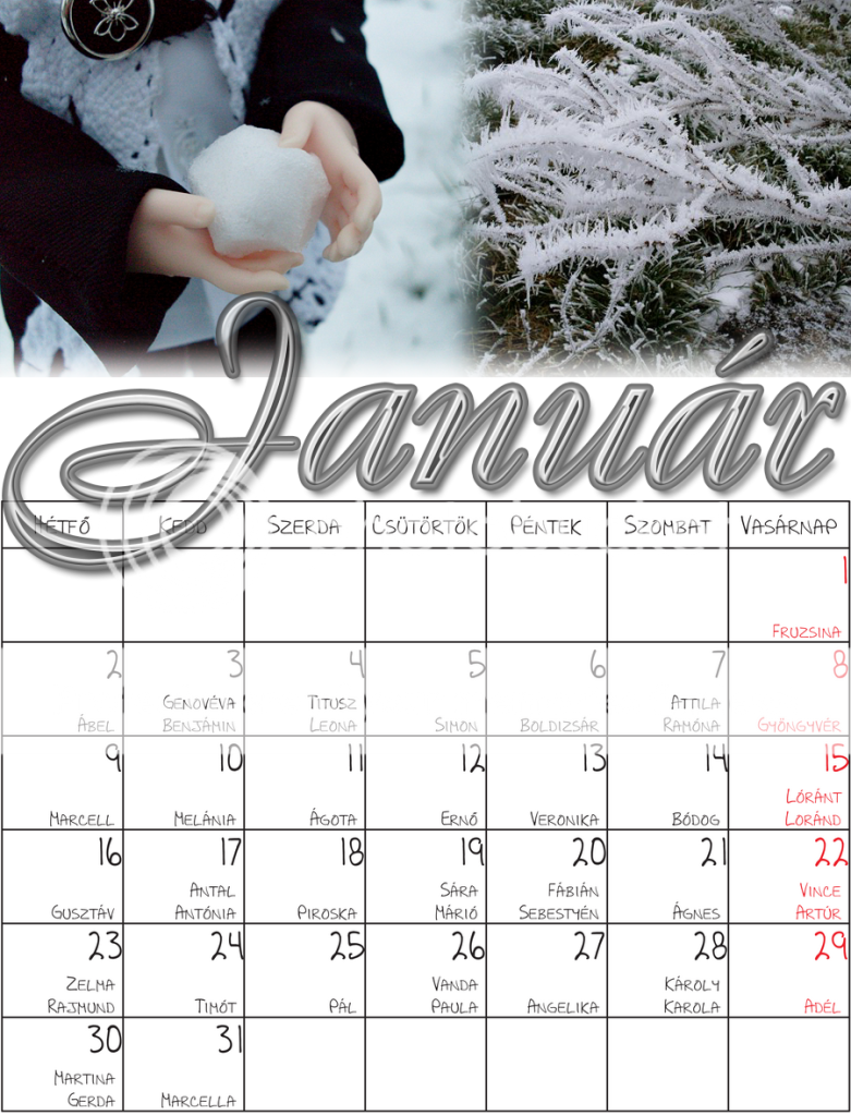 Ez pedig a januári naptár, amit csináltam. Hamarabb is fel akartam rakni, hogy mások is használhassák, de elmaradt. ^^" Mindegy, mi használtuk. xD Egyébként Alvin keze látható rajta, a tavalyi téli képekből van. Katt rá a nagyobb méretért.